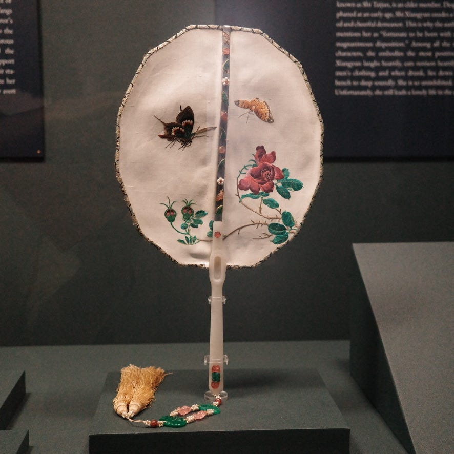 展覽中有晴雯可能會戴的指甲套、襲人可能會用的金釵、史湘雲可能會使用的扇子、薛寶釵房裡可能會用的仿定窯白瓶、林黛玉可能會縫的荷包⋯⋯